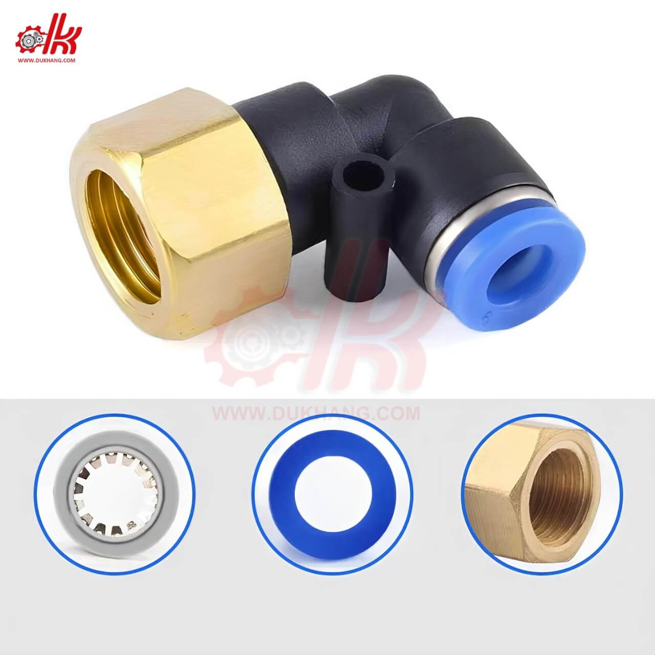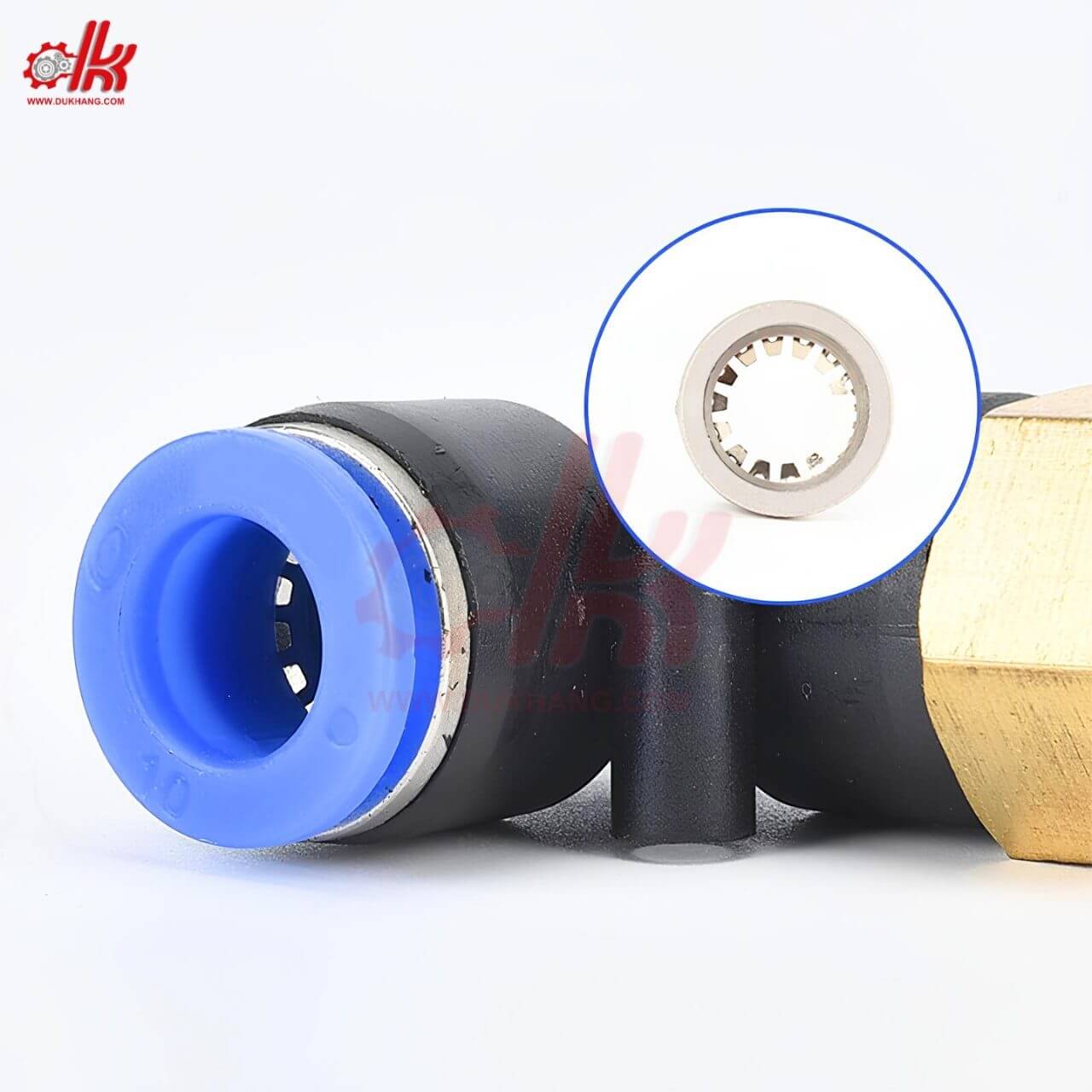 - ● Bên trong có cơ cấu kẹp bằng vòng kim loại và phớt cao su, giúp giữ ống chắc chắn và chống rò rỉ khí.