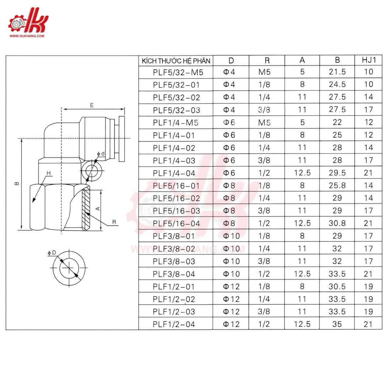 Thông Số Kỹ Thuật Của Co Chữ L Nối Khí Nén Ren Trong PLF