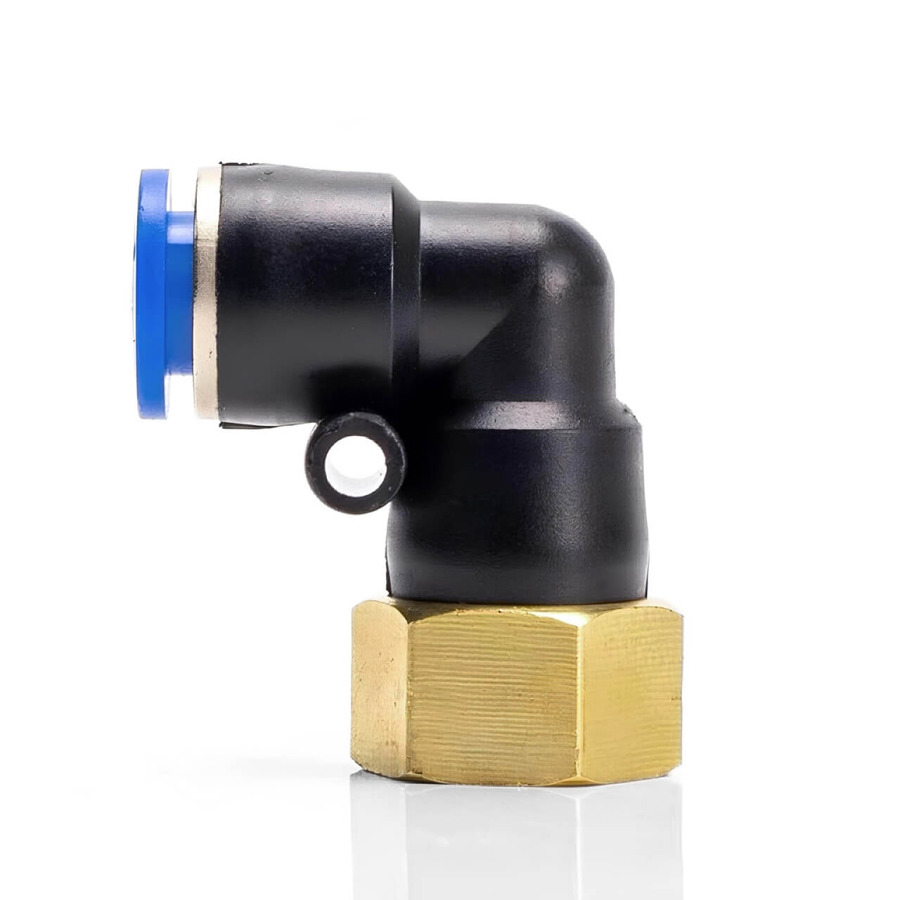 Co chữ L nối khí nén ren trong PLF ren trong được thiết kế với cấu trúc chắc chắn, kết hợp giữa vật liệu nhựa kỹ thuật cao cấp và ren kim loại bền bỉ, giúp đảm bảo độ kín khí và độ bền lâu dài trong hệ thống khí nén. Dưới đây là các bộ phận chính cấu tạo nên sản phẩm: