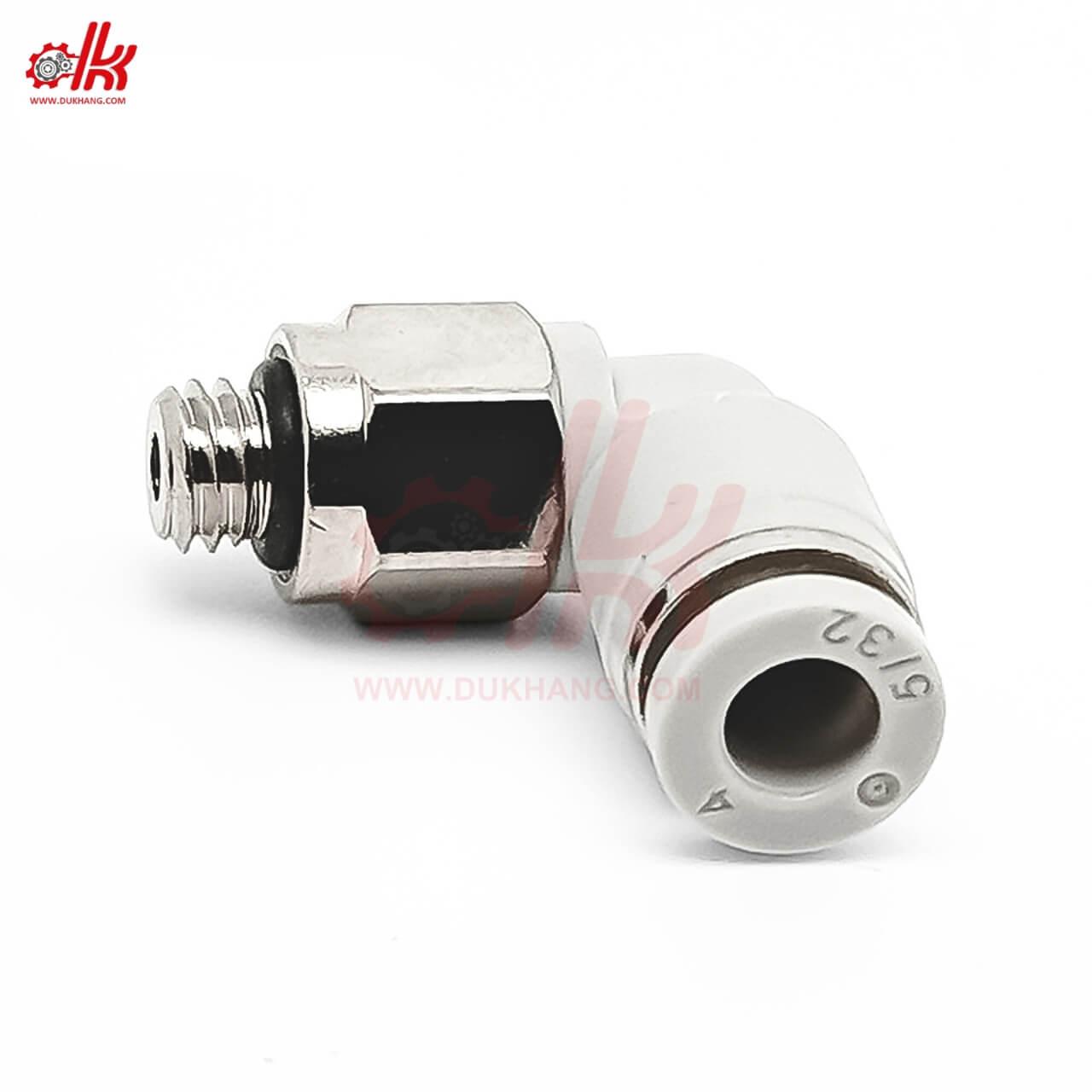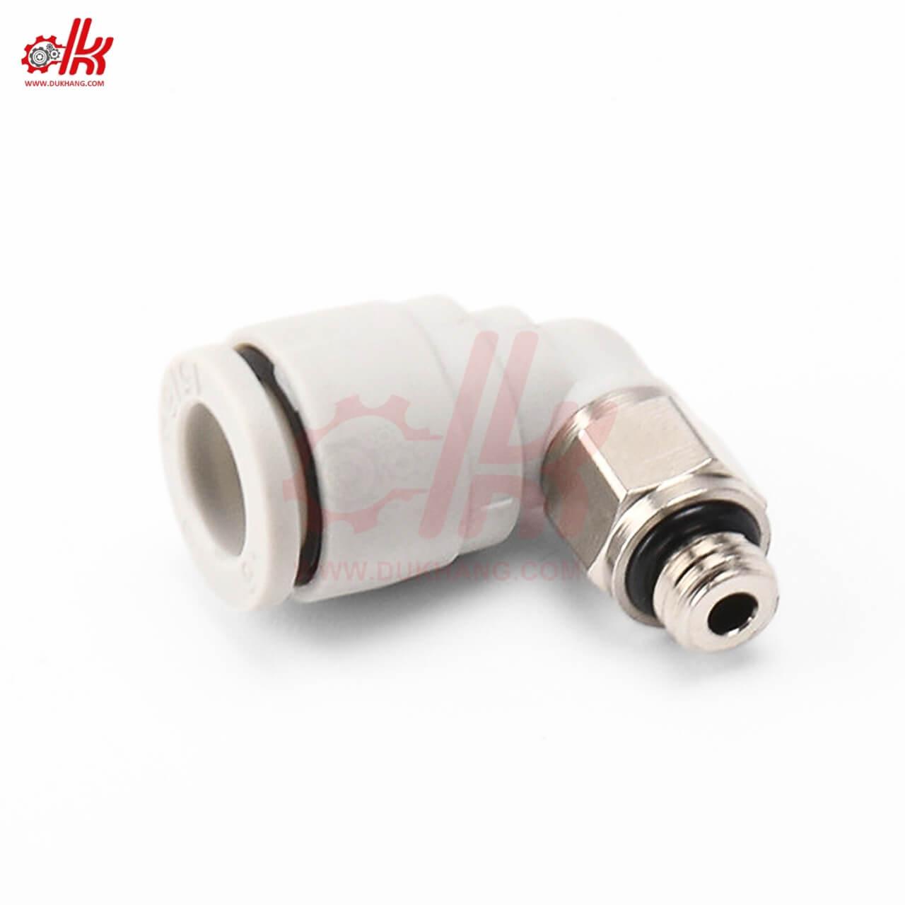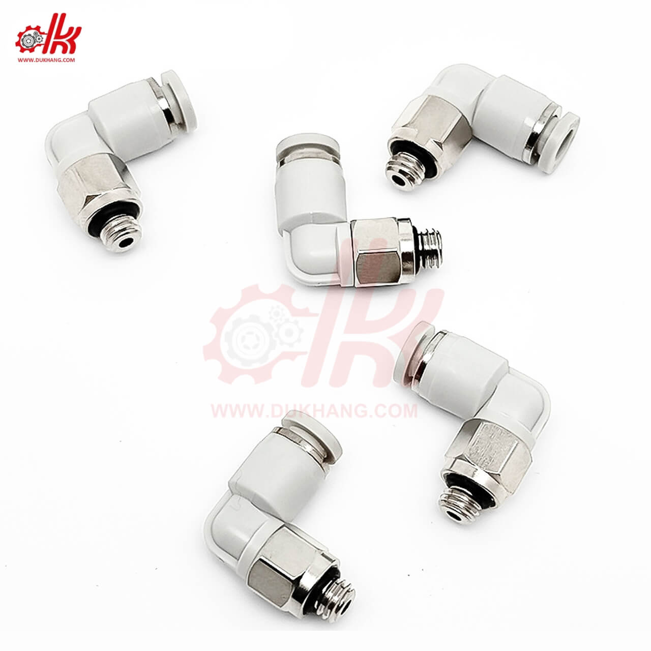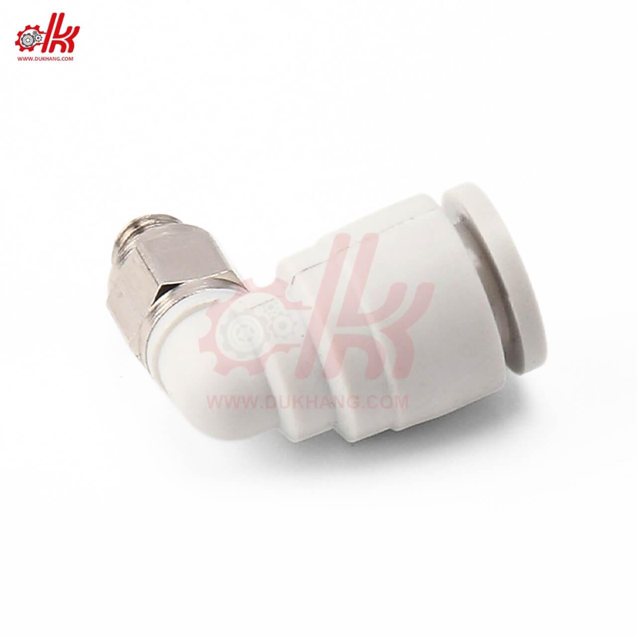 Thân đầu nối: Đây là phần chính của đầu nối, thường được làm từ nhựa kỹ thuật cao cấp như PBT (Polybutylene Terephthalate) hoặc POM (Polyoxymethylene). Vật liệu này có khả năng chịu va đập, chống ăn mòn và có độ bền cơ học tốt. Thân đầu nối có hình dạng cong 90 độ, giúp định hướng ống khí nén theo góc mong muốn. Màu sắc phổ biến là trắng hoặc xám, phù hợp với nhiều môi trường công nghiệp.