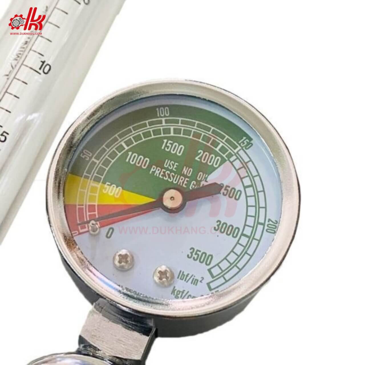 Đồng hồ đo áp suất (Pressure Gauge): Đồng hồ này hiển thị áp suất hiện tại của khí oxy trong bình. Với các vạch chia rõ ràng (thường là psi, kgf/cm² và MPa), người dùng có thể dễ dàng theo dõi lượng oxy còn lại và biết khi nào cần thay bình. Đồng hồ có mặt kính bảo vệ, giúp chống va đập và dễ dàng quan sát.