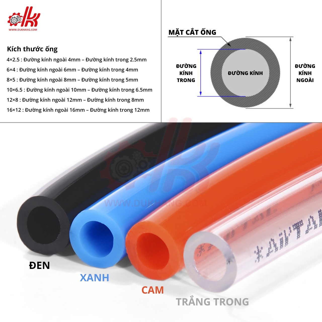 - Kích thước ống: 3.2×2, 4×2.5, 6×4, 8×5, 10×6.5, 12×8, 16×12