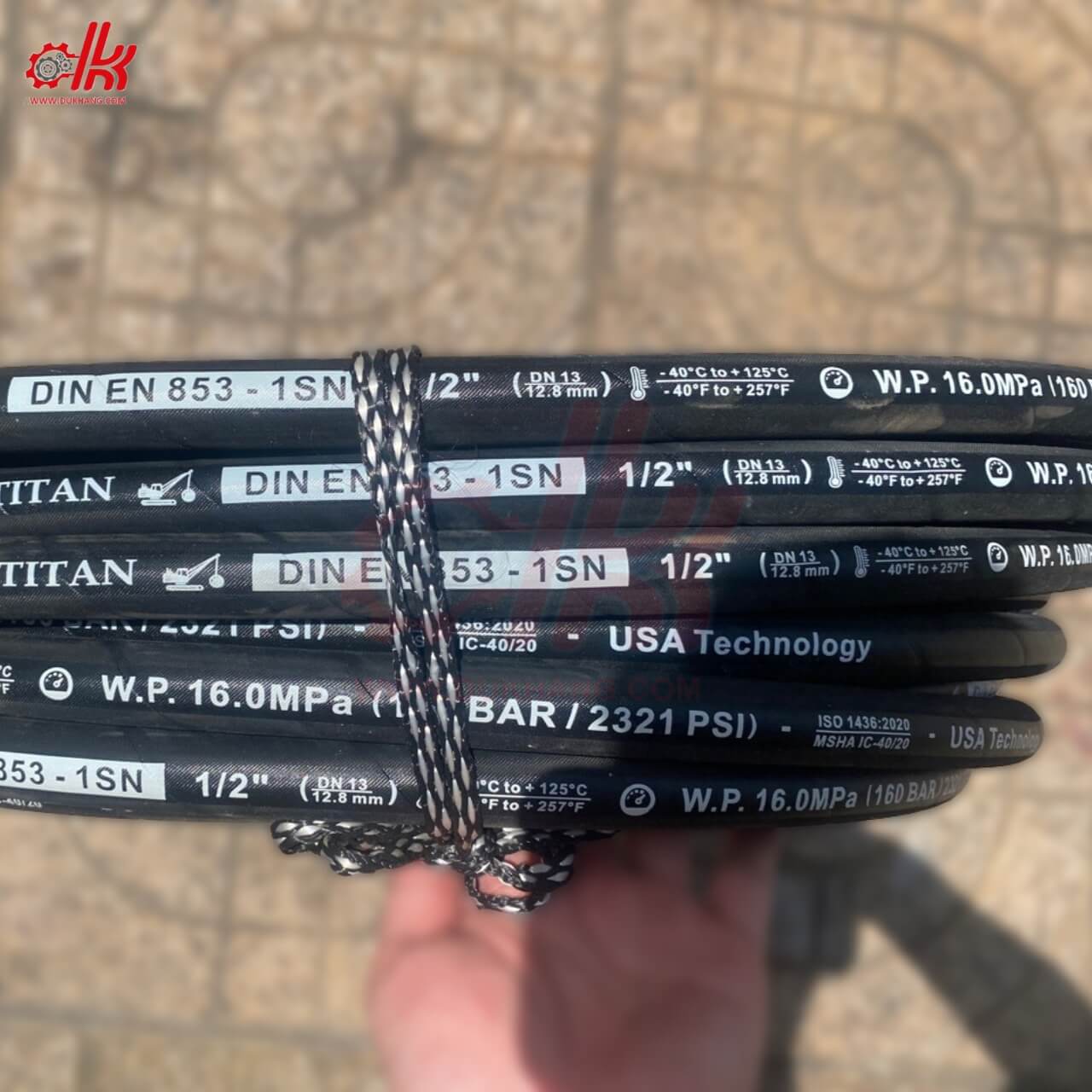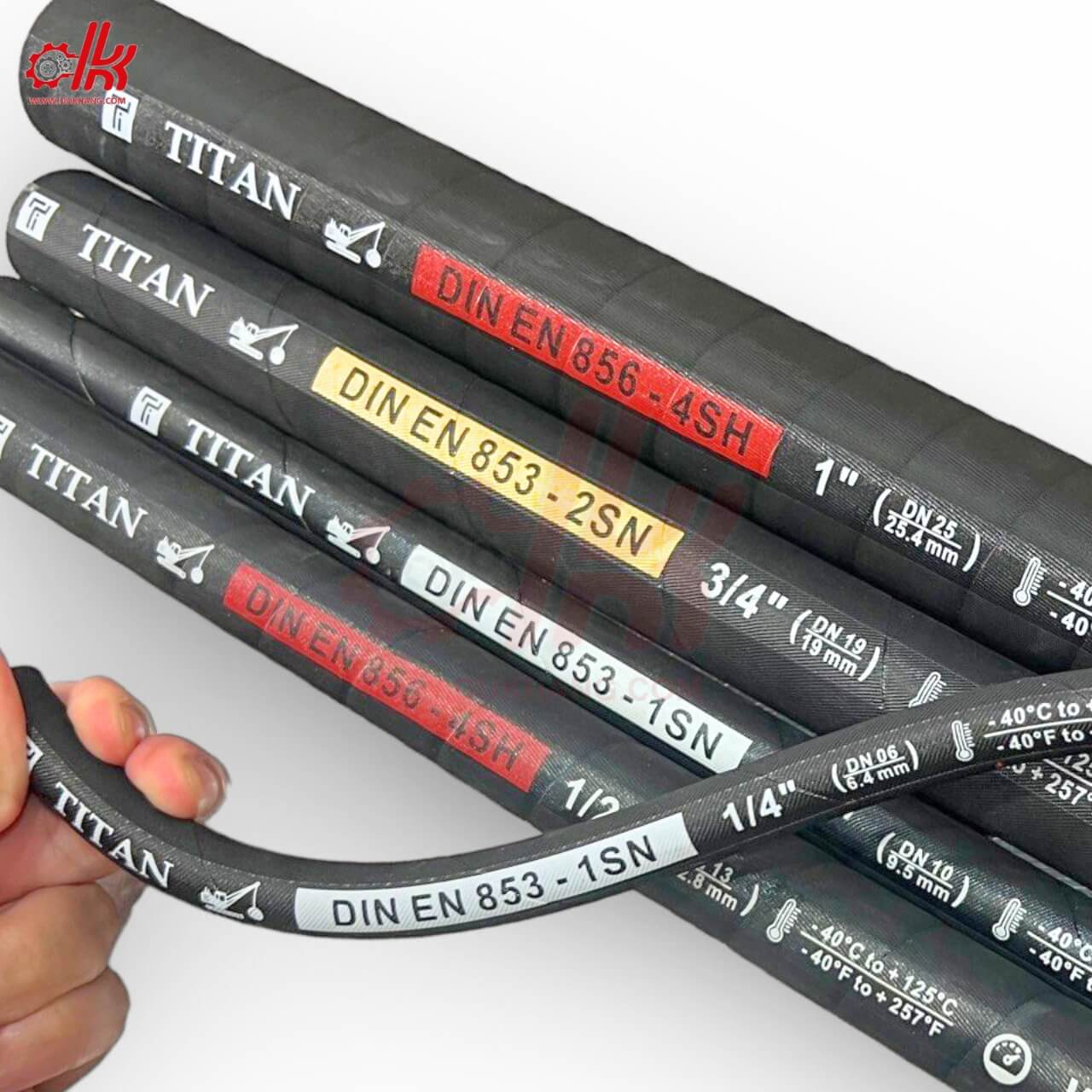 - ● Trên bề mặt ống thường in rõ thông số kỹ thuật như: tiêu chuẩn DIN (EN 853 1SN, 2SN; EN 856 4SH…), kích thước ống (inch/mm), dải nhiệt độ làm việc, áp suất định mức và logo thương hiệu Titan.