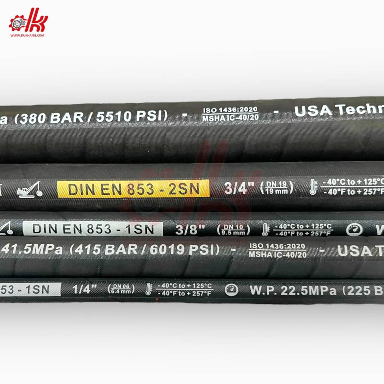 - ✅ Chịu áp lực cao vượt trội: Đạt chuẩn DIN EN 853 (1SN, 2SN), DIN EN 856 (4SP, 4SH), đảm bảo hoạt động ổn định ở mức áp suất cao từ 150 bar đến trên 600 bar.