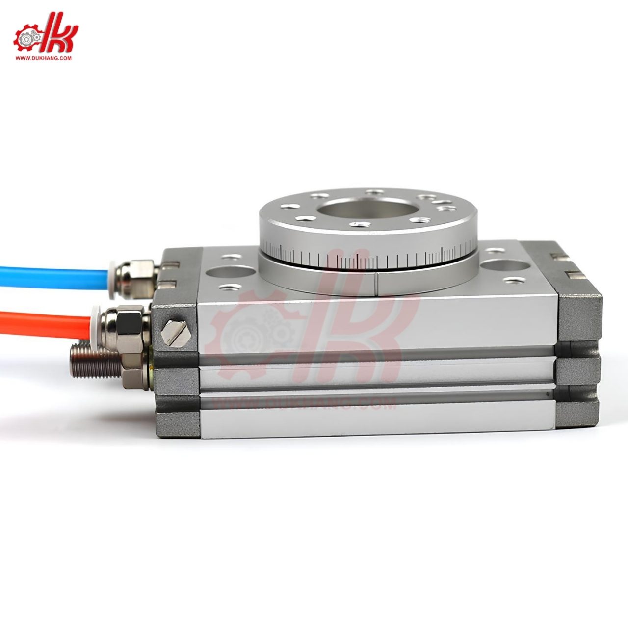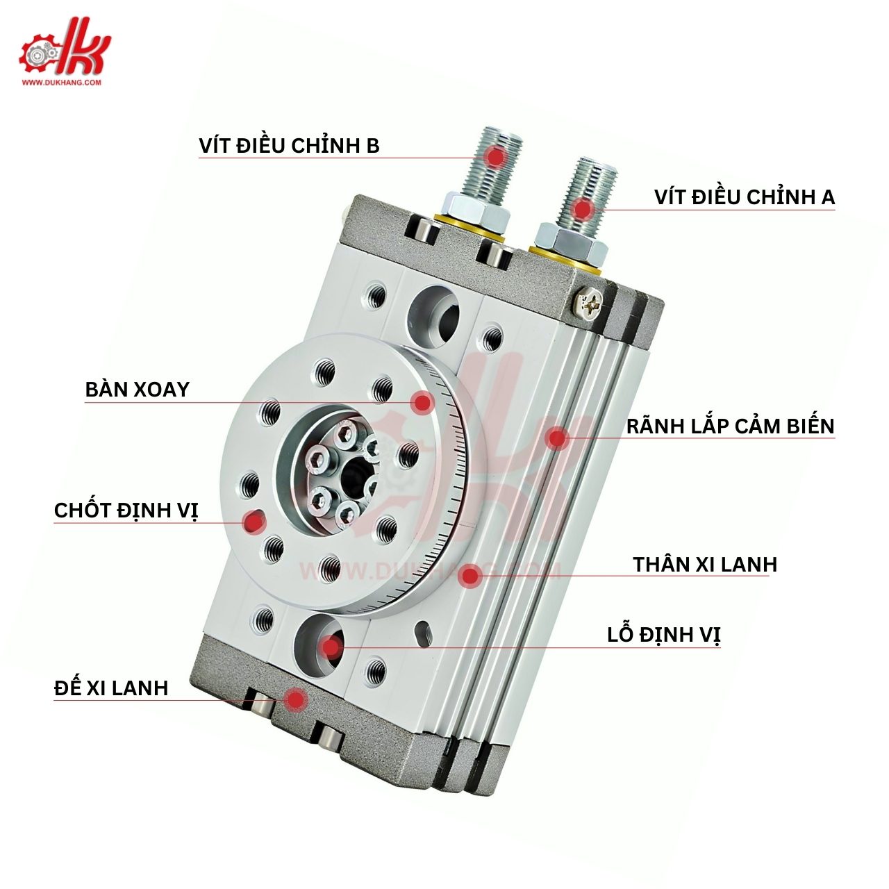 - Độ Bền Cao – Chống Mài Mòn Tốt: Thân xi lanh làm từ hợp kim nhôm cao cấp, chống ăn mòn, chịu lực tốt. Trục xoay được làm từ thép không gỉ, giúp chịu tải lớn mà không bị cong vênh. Bộ phớt khí chất lượng cao, giúp giảm ma sát và tăng tuổi thọ xi lanh.